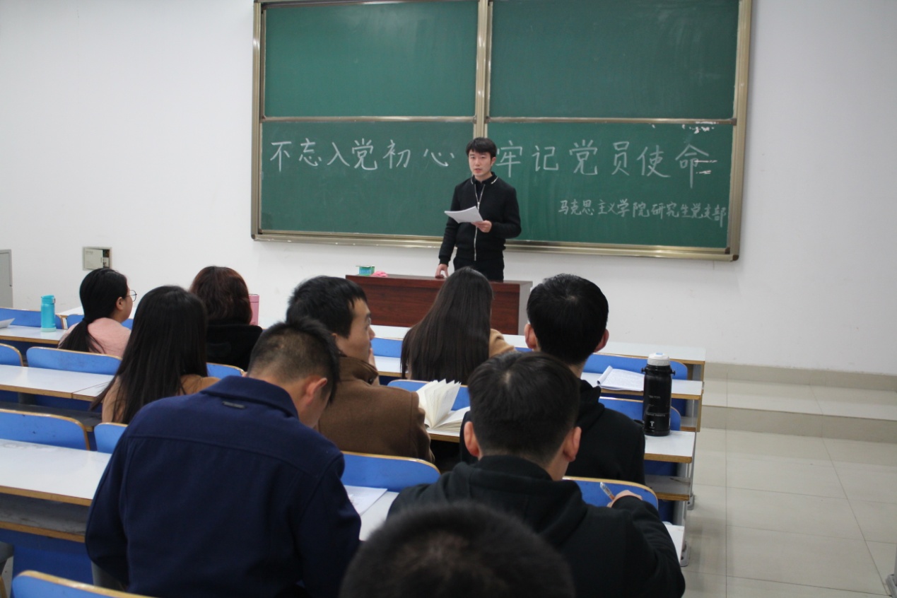 2017年11月14日下午,金年会官网研究生党支部在社科楼325教室举行了主题为“不忘入党初心,牢记党员使命”的十九大报告学习活动。活动由支部副书记魏中龑主持,全体成员参加了活动。