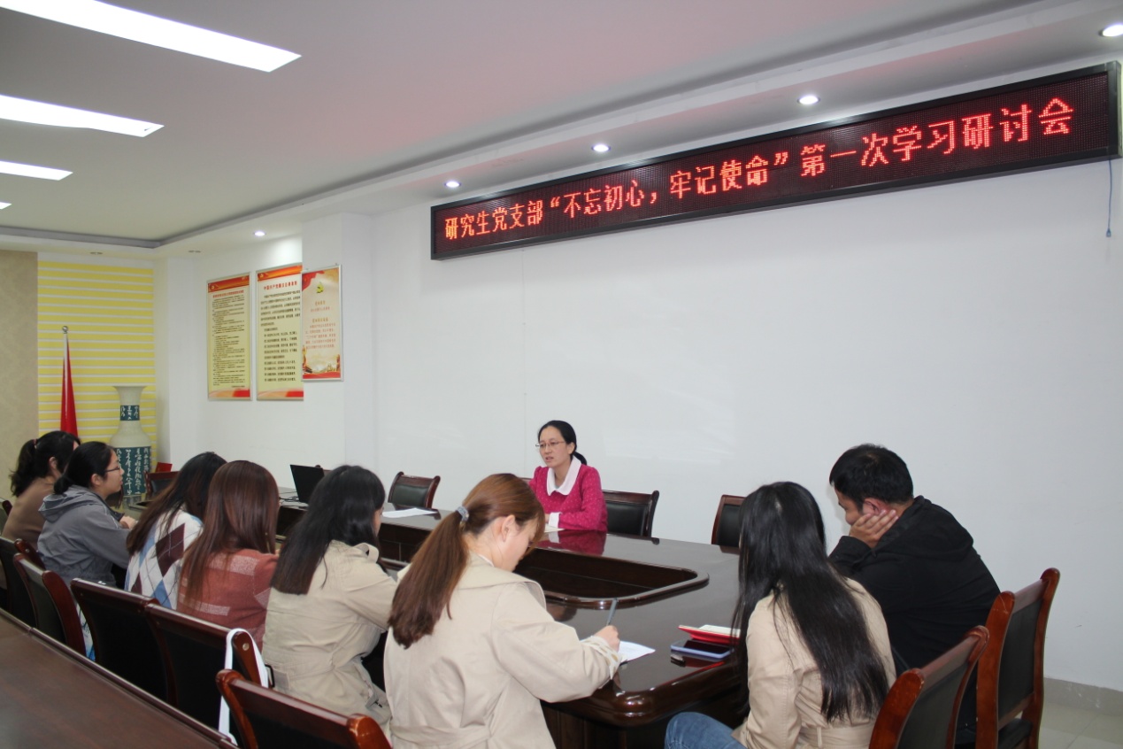 为提高党员政治觉悟,强化党员责任意识,10月29日下午,金年会官网研究生党支部在社科楼323会议室开展了“不忘初心、牢记使命”主题教育第一次学习交流会,支部全体党员参加会议。会议由支部书记卢云晓主持。