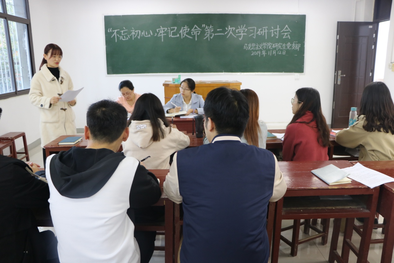 为继续强化主题教育成果,11月12日下午,金年会官网研究生党支部在教五楼203教室开展了“不忘初心、牢记使命”第二次学习交流会,支部党员和入党积极分子参加会议。会议由支部书记卢云晓主持。