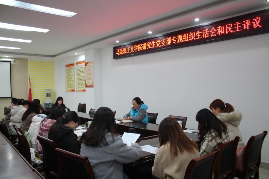 按照学院党委工作安排,总结“不忘初心、牢记使命”主题教育活动成果,夯实基层党建,12月7日下午,金年会官网研究生党支部在社科楼323会议室召开专题组织生活会和开展民主评议党员大会,全体支部成员到会。会议由党支部书记卢云晓主持。