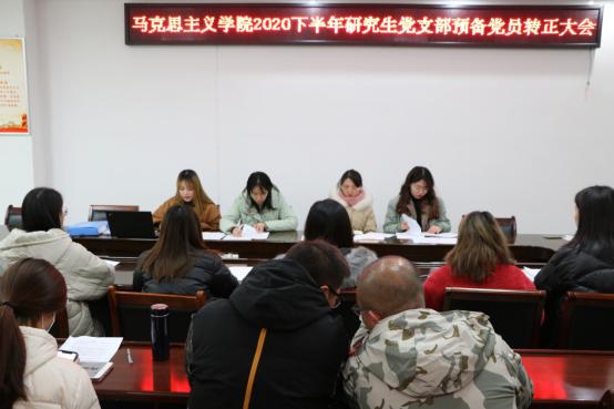 12月7日下午,金年会官网研究生党支部于社科楼323会议室召开预备党员转正大会,讨论了预备党员张英、黄士家、董梓茜三位同志的转正问题。会议由支部副书记刘润博主持,支部全体党员参加了会议。
