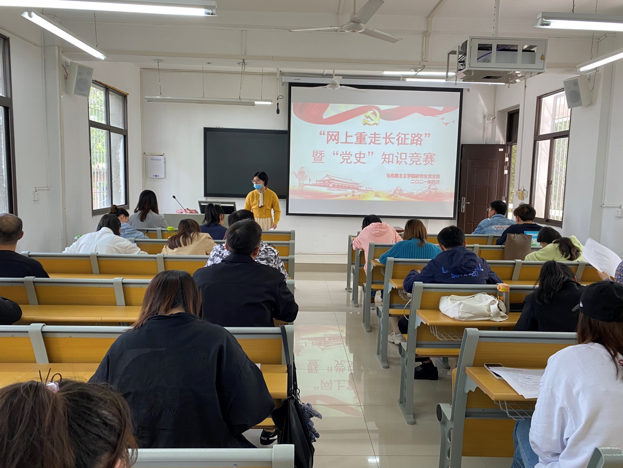 为深入贯彻落实习近平总书记在党史学习教育动员大会上的重要讲话精神,引导广大党员同志感悟百年辉煌党史,坚定理想信念。4月27日下午,在教五203教室金年会官网研究生党支部开展“网上重走长征路”暨“党史“知识竞赛答题活动,支部全体党员、入党积极分子参加此次活动,活动由支部书记郑晨霞老师主持。