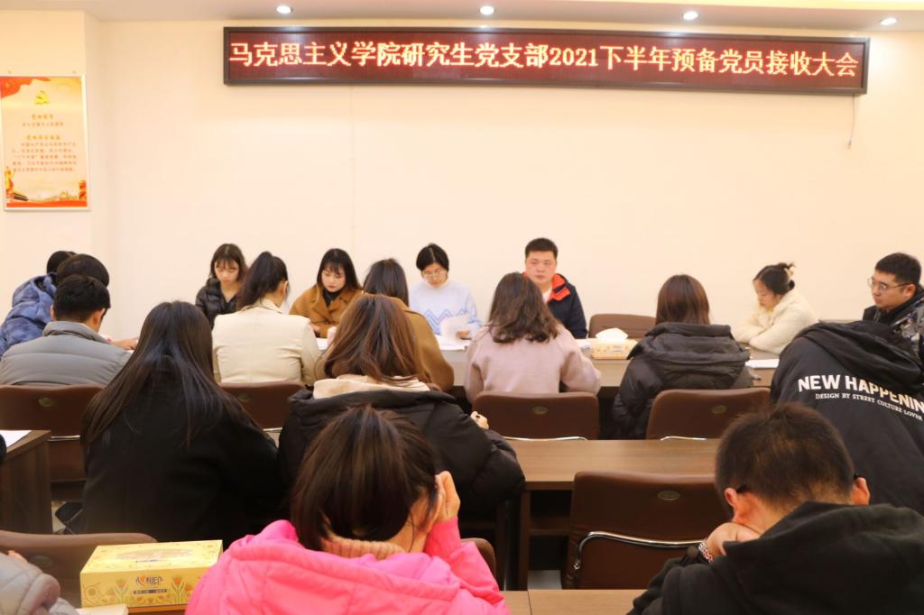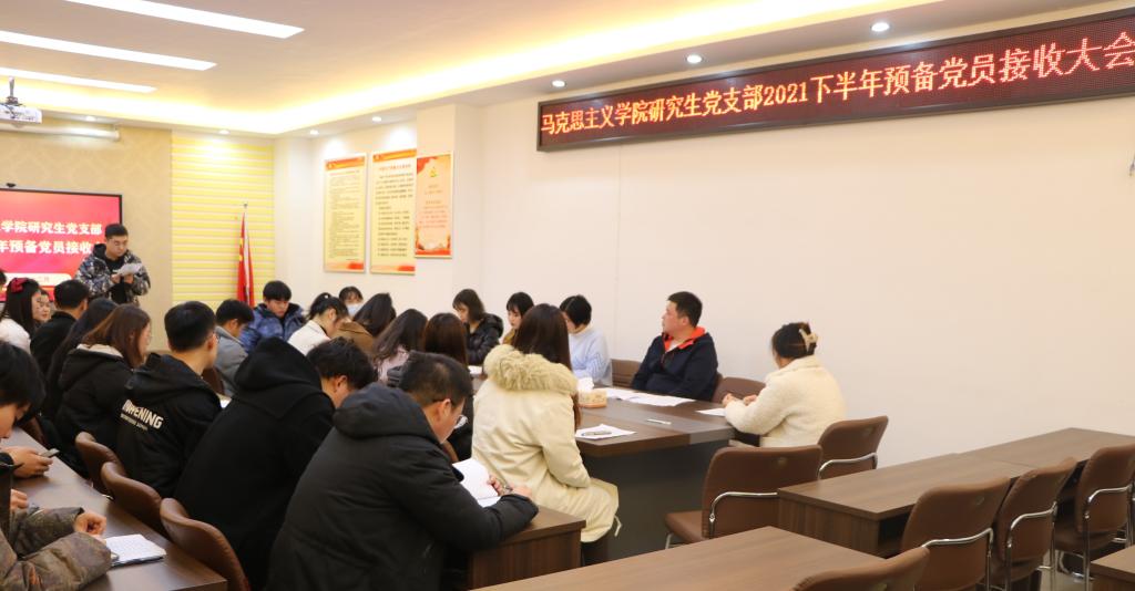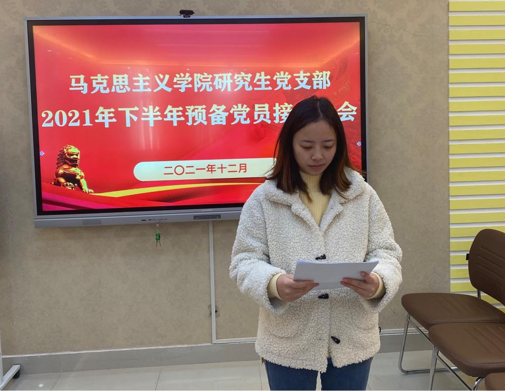 12月2日下午,金年会官网研究生党支部于社科楼323会议室召开2021下半年预备党员接收大会,讨论了王浩、李婷婷、余海玲、张丹雅、张紫鑫、周韵诗、孟祥琳、郭倩、崔浩婷、樊悦十位同志转为中共预备党员的问题。本次会议由支部书记郑晨霞主持,监票人由宣传委员李胜担任,计票人由小组长王澳远担任。