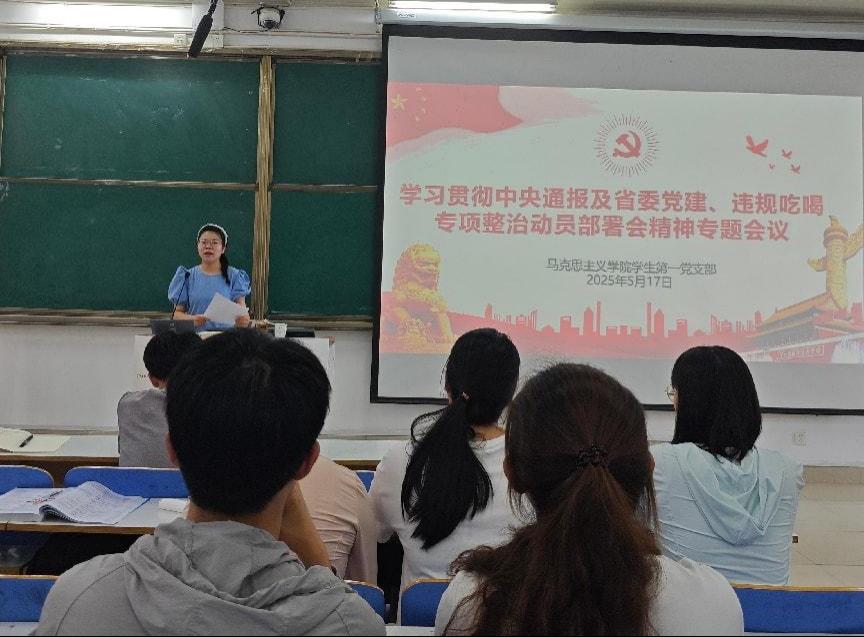为进一步加强学生党支部建设,强化党员纪律意识,2025年5月17日,信阳师范大学金年会jinnianhuicom学生第一党支部召开了学习贯彻中央通报及省委党建、违规吃喝专项整治动员部署会精神的专题会议。会议由学生党支部书记高小佳主持,全体学生党员参会。