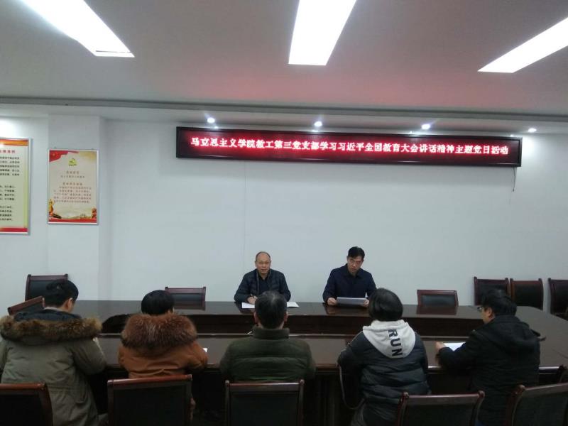 为了充分发挥教工党员的先锋模范作用,树立教工党员的良好形象,2018年12月28日下午,金年会jinnianhuicom教工第三党支部在学院323会议室顺利召开“学习习近平全国教育大会讲话精神”主题党日活动。会议由支部书记厉有国同志主持。