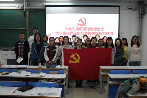 首先,曲新宇组织全体党员发展对象与党旗合影并对活动召开的目的、意义进行简要介绍。接着,各党员发展对象依次发言,各抒己见。肖妍杰从三个方面详述了大学生如何坚定理想信念。她提到,大学生对于理想信念应有深刻的认识,以大局为重,不断丰富理论知识,练就过硬本领。毛燕着重分析大学生党员坚定共产主义信念的重要意义。她谈到,大学生应从实践出发,在艰苦奋斗的同时加强自身的党性修养,提高自身思想道德素质。现场讨论气氛浓厚,各发展对象纷纷表示要不忘初心,树立坚定的理想信念。
