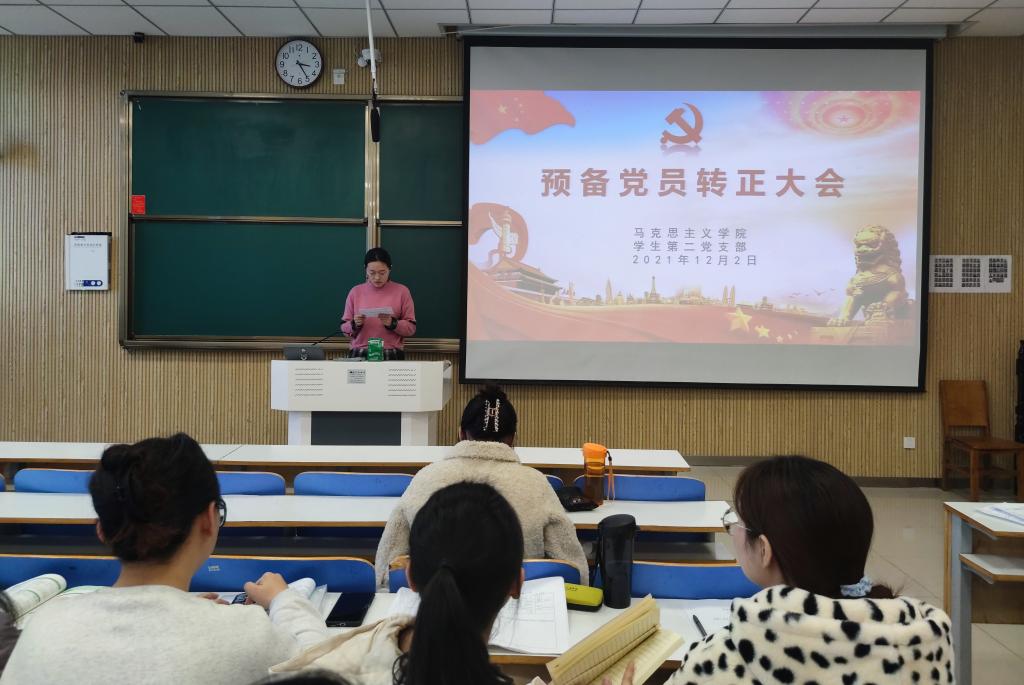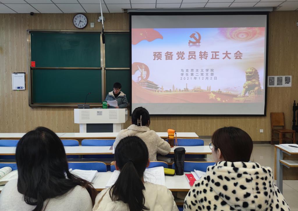 12月2日下午,金年会jinnianhuicom学生第二党支部在社科楼515教室召开2021年下半年接收预备党员转正支部大会,金年会官网学生第二党支部正式党员曹梦真、杨康、王文慧、张甜甜、黄子晋,学生第二党支部预备党员和党员发展对象共同参加本次会议。会议由杨康主持。