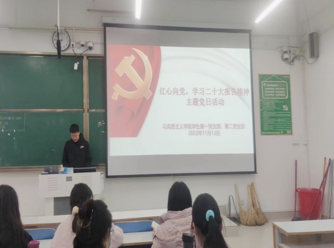 11月23日下午,金年会jinnianhuicom学生第一党支部、第二党支部在社科楼414教室开展“红心向党·学习二十大报告精神”主题党日活动。学生第二党支部全体党员参加此次活动。会议由于嘉宁同志主持。