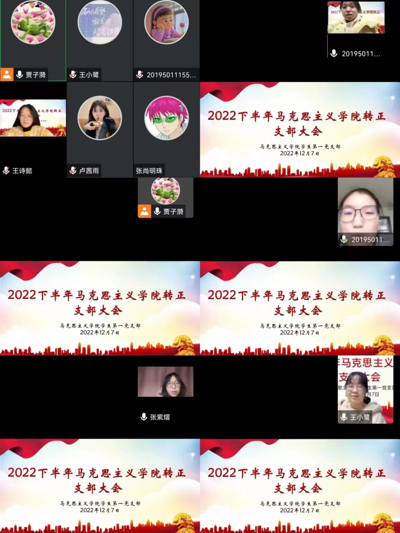 2022年12月7日下午,金年会jinnianhuicom学生第一党支部在腾讯会议召开2022年上半年预备党员转正支部大会。金年会官网学生第一党支部书记高小佳,学生第一党支部正式党员、预备党员共同参加本次会议。会议由卢茜雨同志主持。
