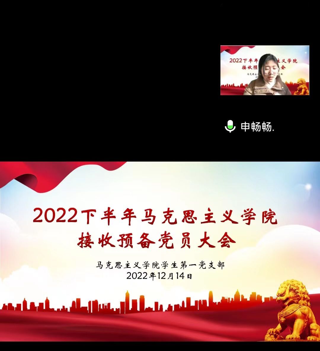 中共信阳师范学院金年会jinnianhuicom学生第一党支部委员会于2022年12月14日在腾讯会议召开了2022年下半年接收预备党员支部大会。金年会官网学生第一党支部书记高小佳,学生第一党支部全体党员,预备党员和党员发展对象共同参加此次会议。会议由卢茜雨主持。