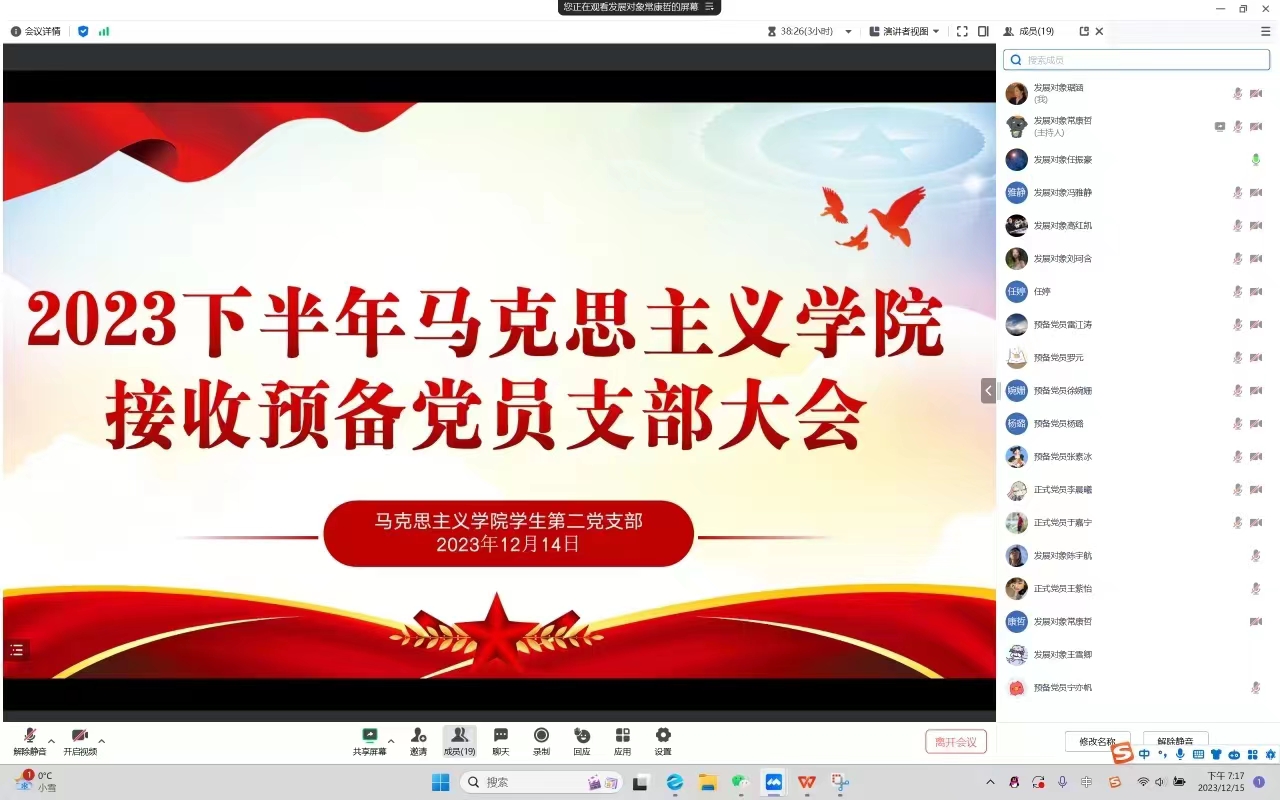 2023年12月14日下午,金年会jinnianhuicom学生第二党支部在腾讯会议组织召开了2023年下半年接收预备党员支部大会。金年会官网学生第二党支部书记任婷、学生第二党支部全体正式党员、预备党员和党员发展对象共同参加本次会议。会议由任振豪同志主持。