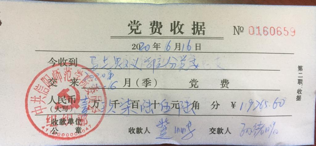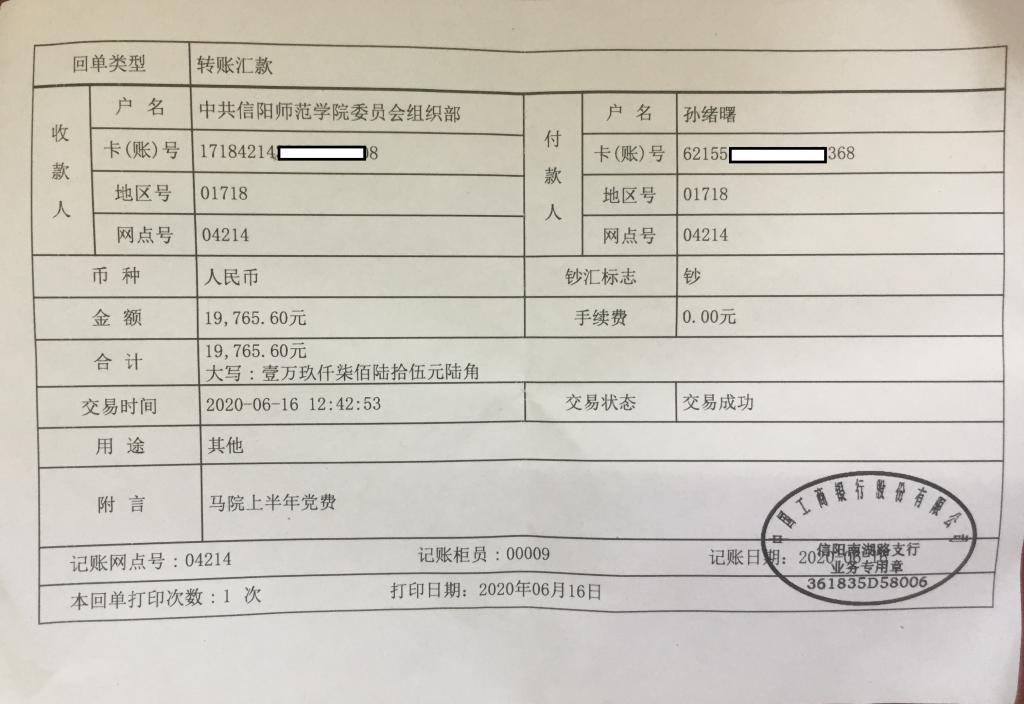 金年会jinnianhuicom2020年1-6月学院师生党员缴纳党费转账单及收据