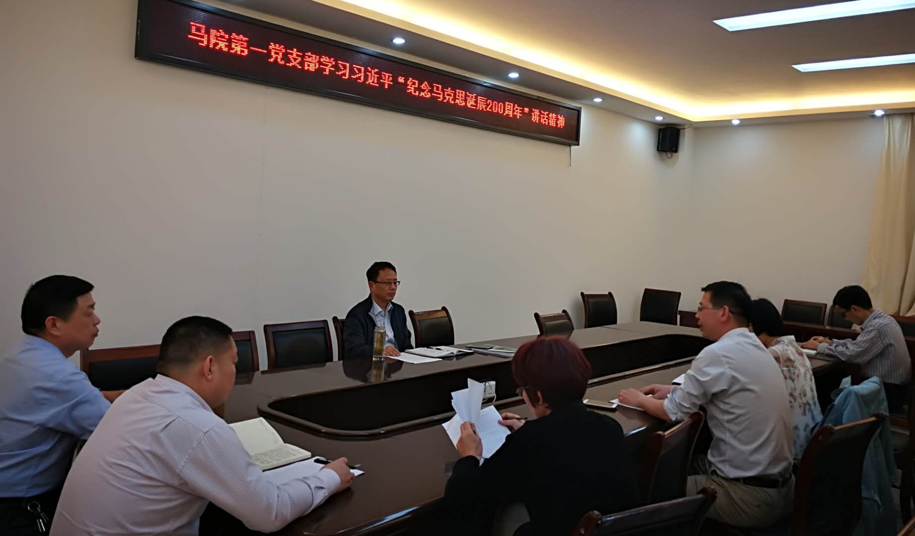5月9日晚,教工第一党支部在支部书记王传富的带领下,在学院323会议室举行了习近平“纪念马克思诞辰200周年大会”讲话精神学习活动。学院党委书记唐国战作为支部成员参加,他从马克思的伟大理论贡献、学院教师要坚持学原著、悟原理,做到真学、真懂、真信、真用等方面进行了学习探讨,并提出,要深刻认识马克思主义理论在意识形态中的极端重要性和理论的科学性、真理性、预见性等特点,结合党的十九大精神,推动思想政治理论课“三进”工作,不仅要讲清、讲好、讲透、讲深,也要讲新,使全体师生不断增强 “四个意识”,坚定“四个自信”。