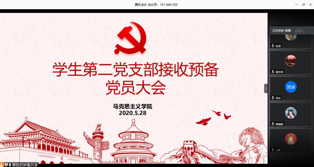 5月28日上午10:00,金年会jinnianhuicom学生第二党支部接收预备党员大会通过腾讯会议线上平台顺利举行。金年会官网学生第二党支部支部书记曹栋、入党介绍人陶青青、杨胜利及第二党支部党员、八位接收预备党员共同参加此次会议。会议由曹栋主持。