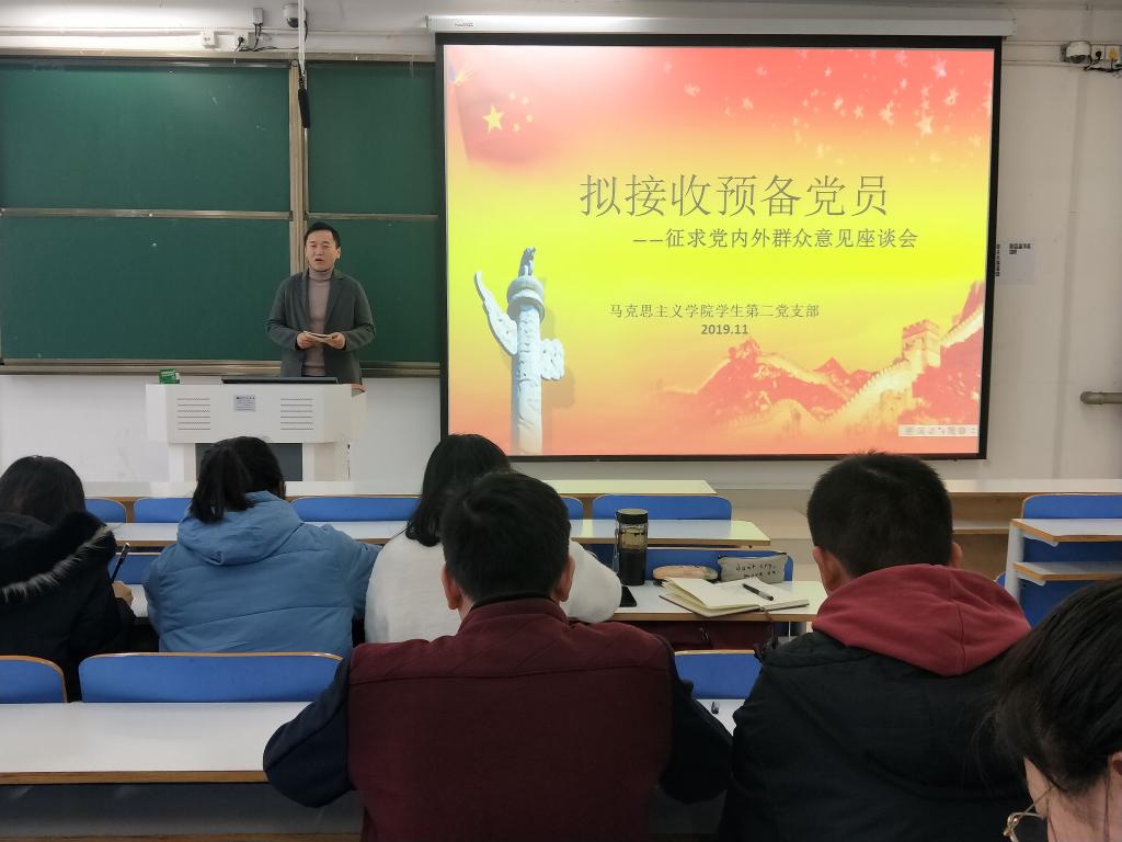 11月25日,金年会官网学生第二党支部在社科楼516教室召开征求党内外群众意见座谈会。学生第二党支部预备党员、发展对象和部分群众参加了此次会议。本次会议由支部书记曹栋主持。