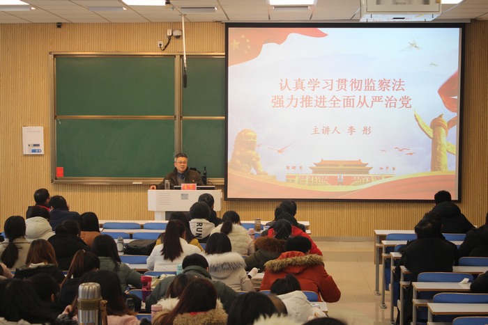 12月11日下午,信阳市纪委监察委副主任李彤莅临金年会官网作了 “认真学习监察法 强力推进全面从严治党”主题报告。金年会官网全体教工党员、学生党员、预备党员、党员发展对象共同聆听了本次报告会。报告会由院党委书记唐国战主持。