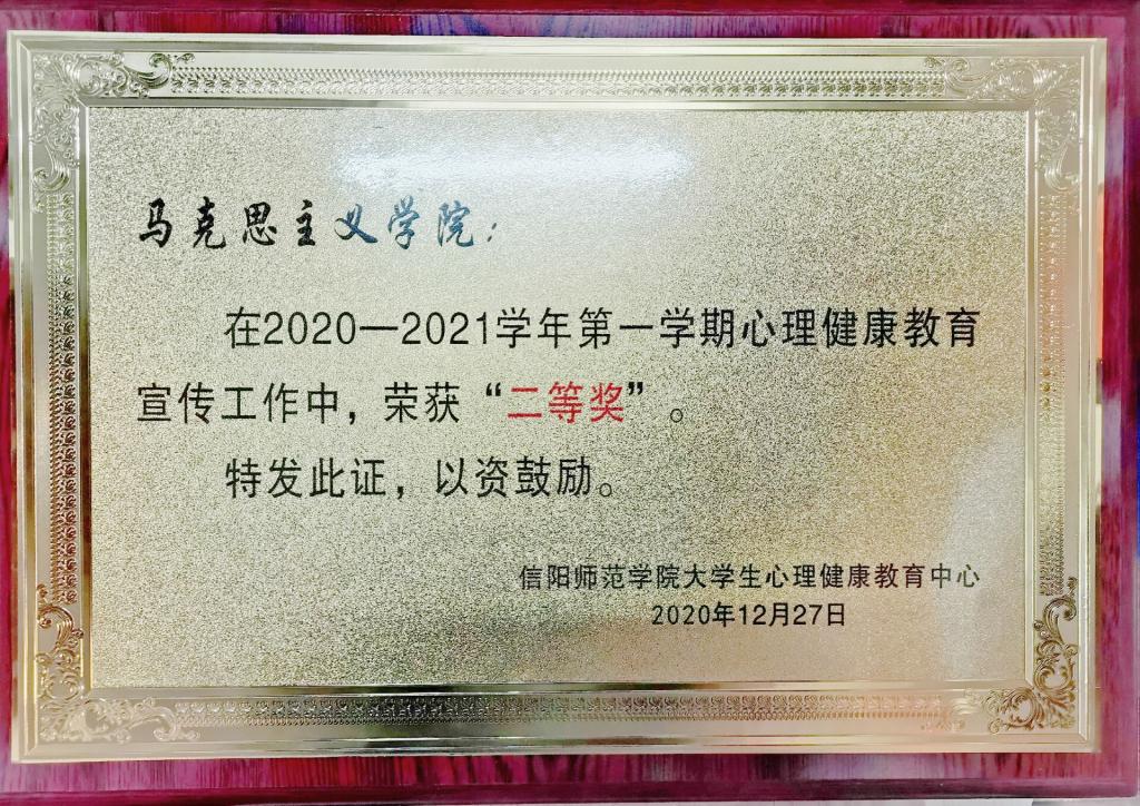 12月29日晚,信阳师范学院大学生心理健康教育中心在逸夫楼报告厅举办“信阳师范学院大学生心理健康教育中心2021年元旦晚会暨年度表彰大会”活动。经评定,金年会官网在第十四届大学生心理健康教育宣传周之心理游园会活动评比中位居第一,在2020-2021学年第一学期心理健康教育宣传工作中,表现突出,荣获“二等奖”,金年会官网学生乔炜林、林兆申、王玮琳被评为“优秀心理工作者”。