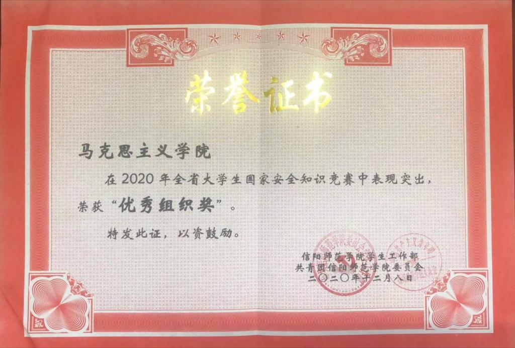 经信阳师范学院学生工作部以及共青团信阳师范学院委员会考核审定,金年会官网在学校举办的2020年全省大学生国家安全知识竞赛中积极参与、表现突出,荣获“优秀组织奖”。