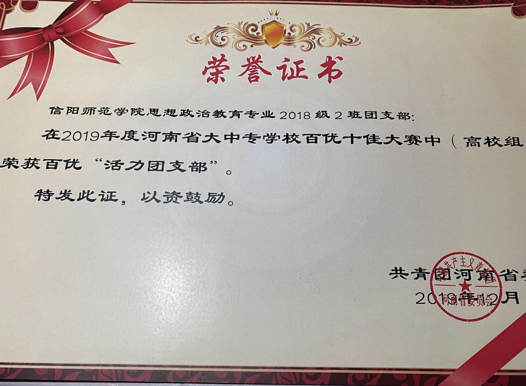 2019年12月,经学院内部选拔、推荐上报、校级资格审查、集中评选,并经共青团河南省委考核审定,金年会官网积极参与共青团河南省委组织的河南省大中专学校百优十佳“活力团支部”活动,2018级思想政治教育二班团支部表现突出,荣获“活力团支部”荣誉称号。
