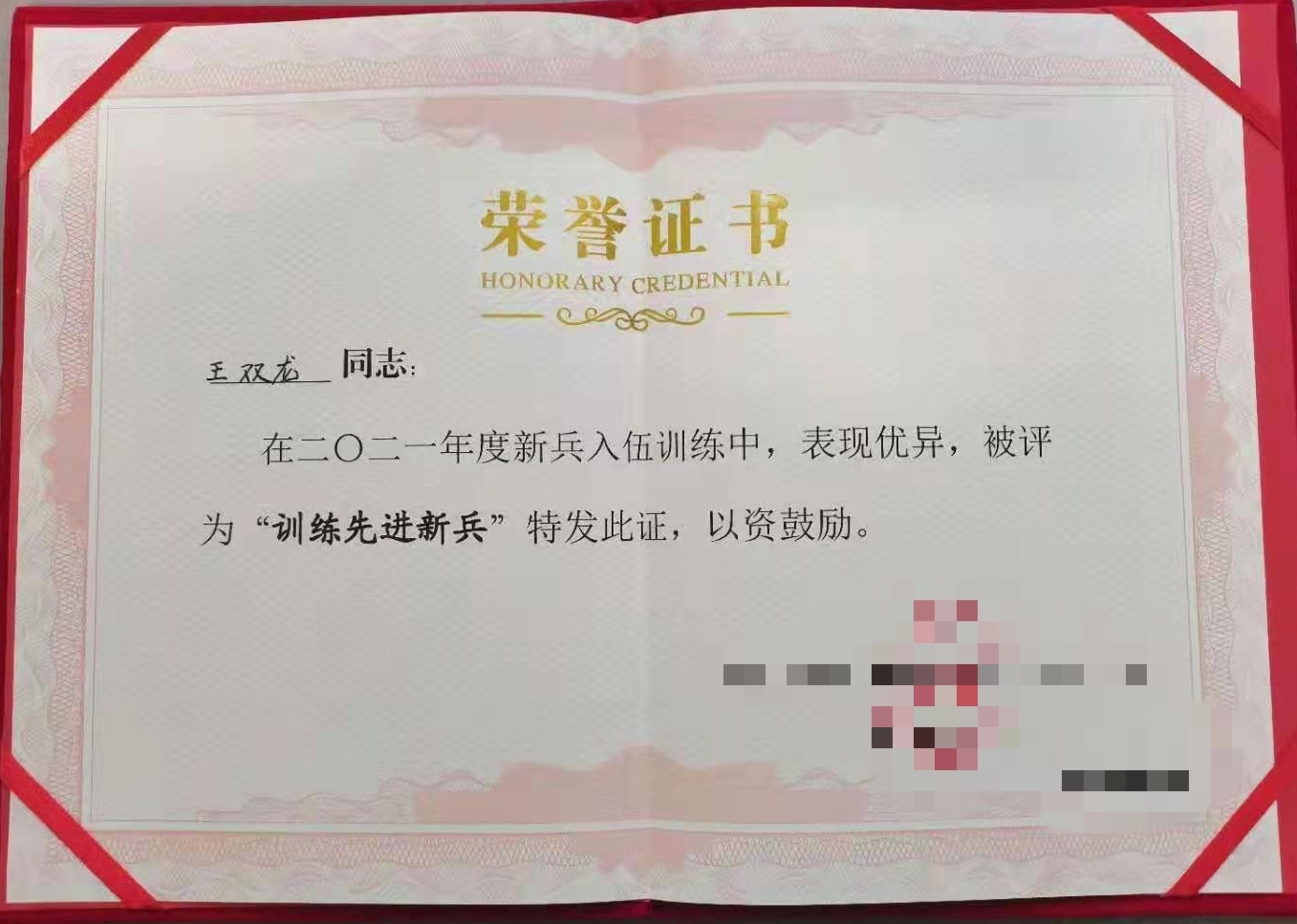 王双龙是金年会官网2020级思想政治教育专业一班学生,2021年应征入伍,目前服役于陆军某部队。入伍以后,王双龙在训练场上勇往直前,淬炼成钢,各方面表现积极,对于工作和任务认真负责,用实际行动唱响自己的军营梦。通过不断努力,王双龙凭借优异表现荣获2021年度“训练先进新兵”称号,受到陆军某部队领导一致好评。