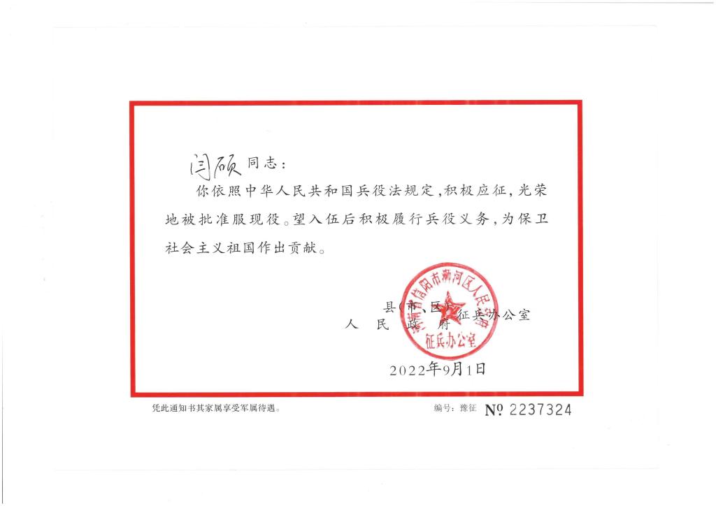 据了解,白杰和闫硕在自身成长过程中便有投身国防、奉献自我的崇高志向,在日常生活中注重提高自身政治觉悟,锤炼意志品质,增强身体素质;在征兵工作中,毅然表明参军意向,主动提交入伍申请材料,并顺利通过层层考核,最终成为一名光荣的义务兵。他们表示,会在军队这个大舞台上施展才华,在军营这个大熔炉中淬炼成钢,将青春与热血挥洒在强军梦、强国梦的伟大实践之中,努力成为一名有灵魂、有本事、有血性、有品德的新时代“四有”军人,为学院增光添彩。据悉,金年会jinnianhuicom始终高度重视大学生征兵工作,不断加大工作统筹力度,详细部署学院征兵计划,切实落实征兵宣传工作,通过征兵主题宣讲会、主题班会与主题团日活动、“一对一”指导等途径开展宣传工作,积极动员广大青年学生应征入伍,大力营造“我参军,我光荣”的校园文化氛围,激发金年会官网学子崇尚军人的深厚情怀,进一步提升金年会官网学生报名参军的热情,致力于将更多的高素质人才输送到国防建设中去。