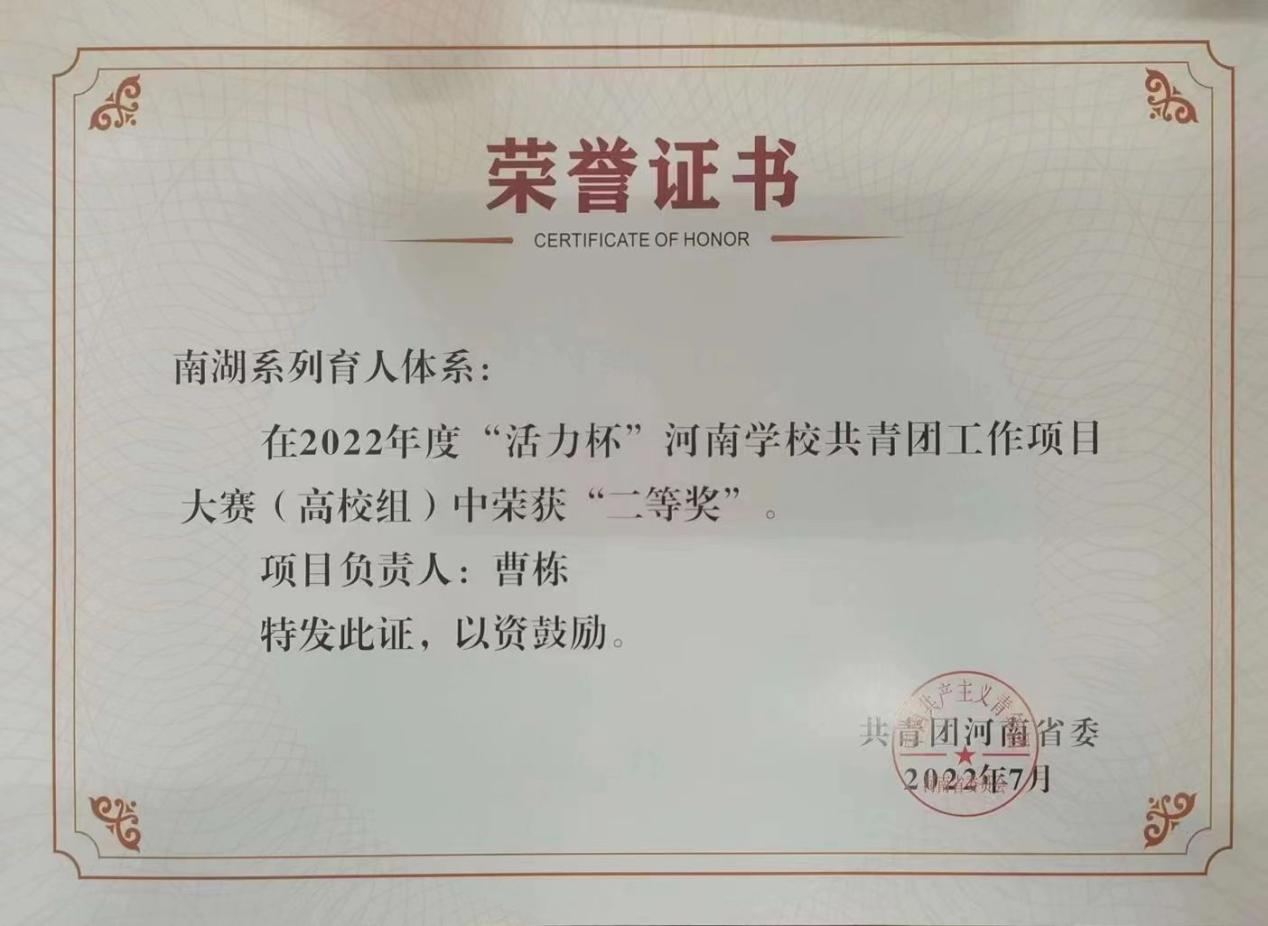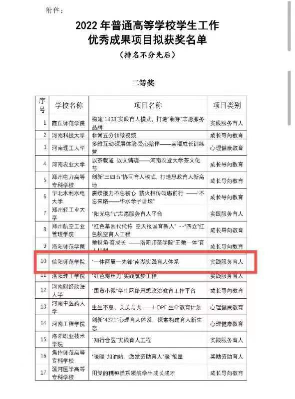 为深入学习贯彻党的二十大精神,河南省教育厅办公室组织开展了2022年普通高等学校学生工作优秀成果项目评选活动。金年会jinnianhuicom“一体两翼一先锋”实践育人体系以脚踏实地的态度、先进的理论指导、丰富多彩的育人活动获得2022年普通高等学校学生工作优秀成果项目拟获奖二等奖。