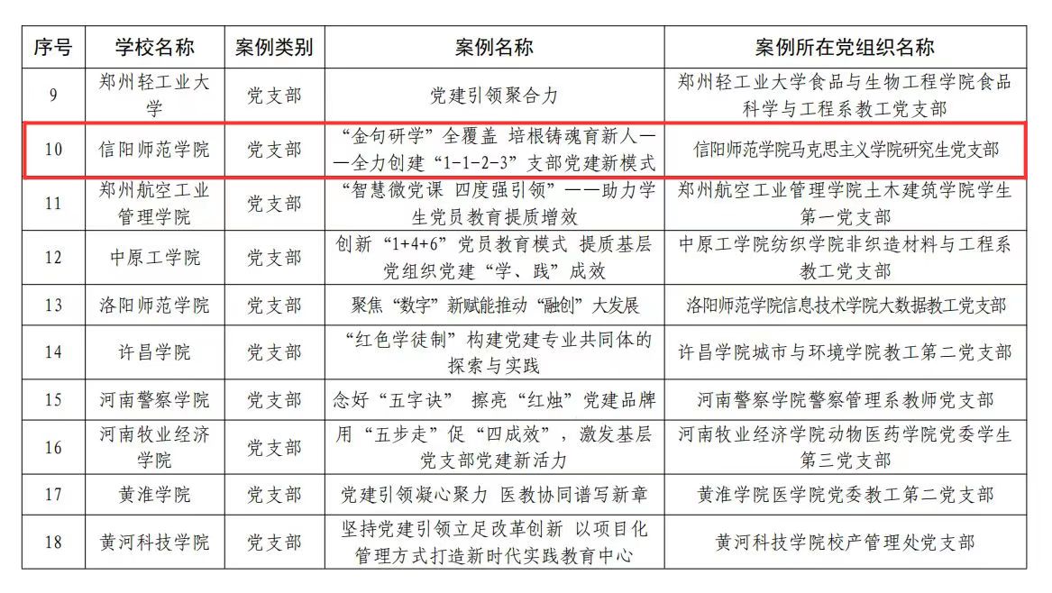 近日,河南省教育厅公布了关于全省高校基层党建创新典型案例评选结果,金年会官网研究生党支部的《“金句研学”全覆盖 培根铸魂育新人——全力创建“1-1-2-3”支部党建新模式》党建创新典型案例荣获高校基层党支部抓党建创新典型案例奖。