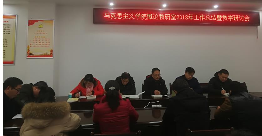 1月10下午,“毛泽东思想和中国特色社会主义理论体系概论”教研室在323会议室召开了教研室2018年工作总结暨教学研讨会。学院党委书记唐国战、副院长黄世明、周智、副书记何晓坚和“概论”课教研室全体教师参加了会议。会议由教研室主任胡春湘主持。
