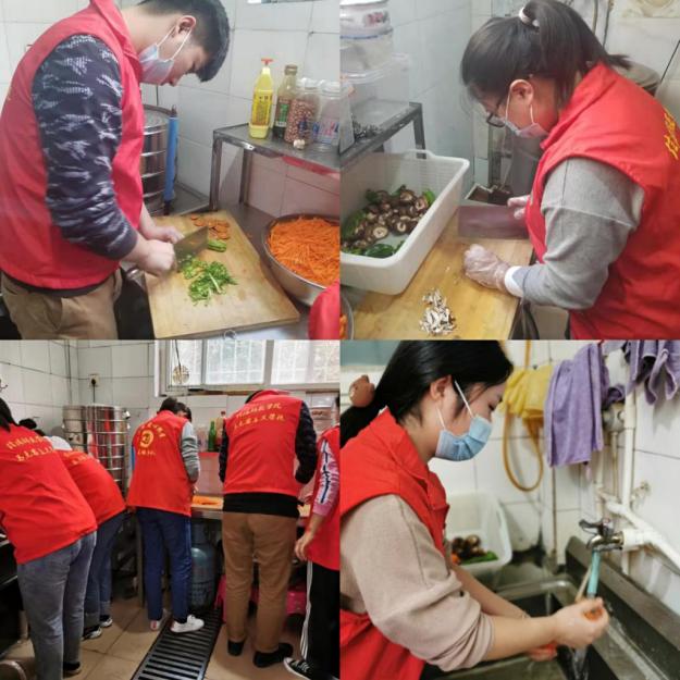 第二志愿服务小组在厨房有序地切菜配菜