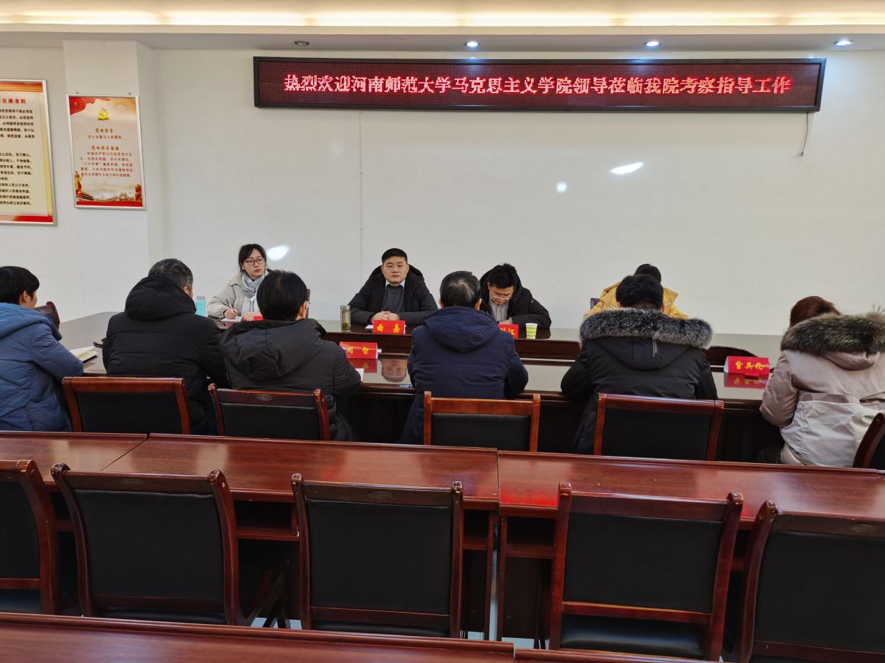 2021年1月8日上午,河南师范大学金年会jinnianhuicom副院长曲嘉一行4人来金年会官网考察交流思想政治教育专业建设工作。金年会官网党委书记唐国战、副院长周智、当代马克思主义研究所副所长兼党委副书记徐永新、副院长程晋富、思想政治教育系主任李蕊及教学办公室人员出席了交流会。会议在社科楼323会议室进行,由党委书记唐国战主持。