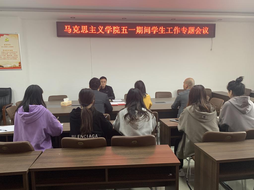 4月29日上午,金年会jinnianhuicom在社科楼323会议室召开五一期间学生工作专题会议,安排部署学院五一期间工作规划。党委副书记黄煌、辅导员曹栋、高小佳、周文豪以及主席团成员共同参加此次会议,会议由黄煌主持。