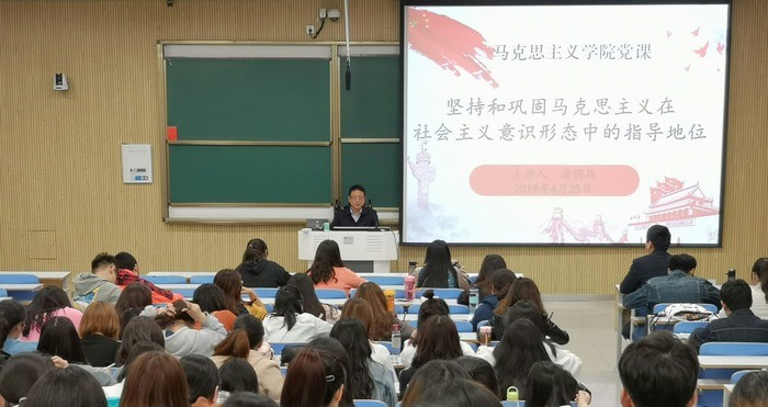 为加强金年会官网学生对意识形态的学习,4月25日晚,金年会jinnianhuicom党委书记唐国战在社科楼515教室讲授了题为“坚持和巩固马克思主义在社会主义意识形态中的主导地位”的主题党课。金年会官网团委书记曹栋、学生第一党支部、第二党支部及入党积极分子共同聆听了本次党课。