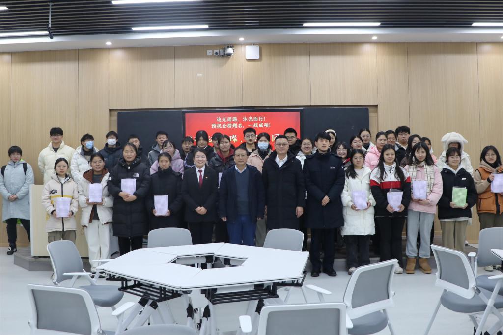 活动伊始,唐国战代表学院关切地询问了同学们的复习情况,并从统筹复习、劳逸结合、心态调整三个方面为同学们提供了宝贵的建议,鼓励同学们要合理规划时间和进度,保持平稳的心态,以咬定青山不放松的韧性、敢叫日月换新天的闯劲、宝剑锋从磨砺出的拼劲、不破楼兰终不还的冲劲去迎接最后的考验。接着,在场老师共同为考研学子送上祝福,希望他们在最后时刻坚持到底,用最好的状态迎接考试。金年会官网还为考研学子准备了不一样的“加油包”:“一战成硕”的卡片、心想事“橙”的橙子、“苹”安上岸的苹果和“一旺到底”的旺仔牛奶等,带有美好祝福的礼物让备战考研的同学们倍感贴心和温暖,饱含了学院老师们对学子们浓浓的关爱和殷切的期盼,以及希望考研学子“一战成硕”美好期许。
