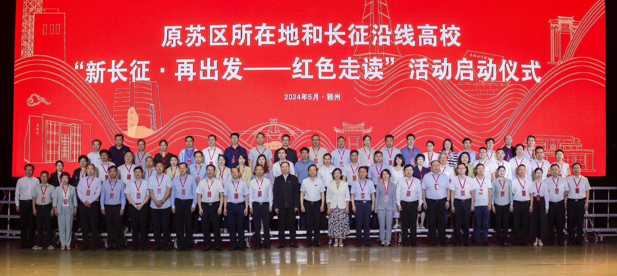 在中央红军长征出发90周年、习近平总书记考察赣南老区5周年之际,5月20日,由赣南师范大学、延安大学、海南师范大学、湖北师范大学、信阳师范大学、江西理工大学等17所高校联合发起的原苏区所在地和长征沿线高校“新长征·再出发——红色走读”活动启动仪式在赣南师范大学举行。原苏区所在地和长征沿线高校分管校领导、党委宣传部、学工部、金年会jinnianhuicom负责同志,瑞金中央革命根据地纪念馆、于都中央红军长征集结出发地等历史博物馆负责同志共计1000余人参加仪式。仪式由赣南师范大学党委副书记刘民主持。我校金年会jinnianhuicom院长唐国战、《中国近现代史纲要》教研室主任陈杰、分团委书记陶青青受邀参加本次活动。