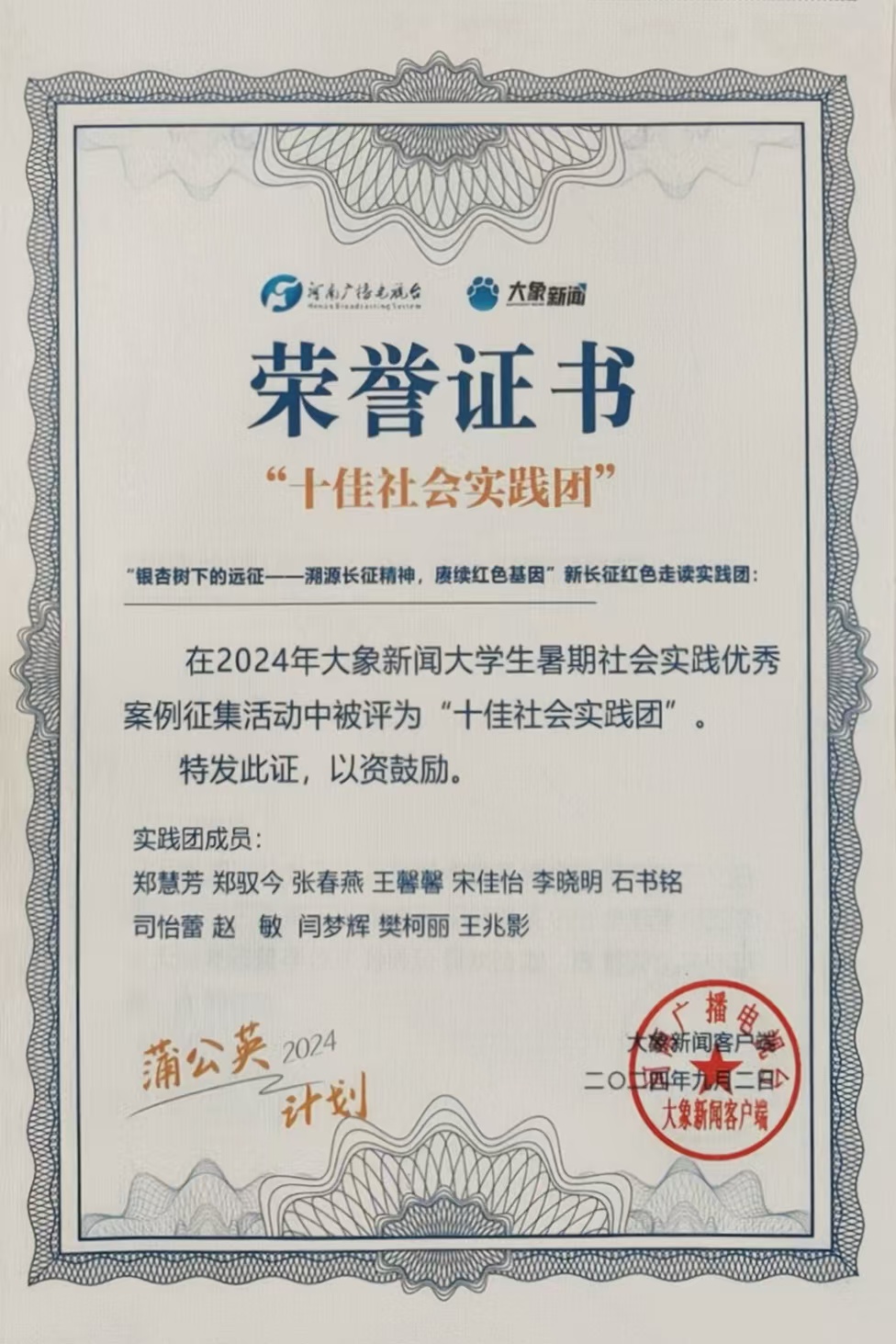 9月2日,由河南省广播电台主办的大象新闻“蒲公英计划”大学生社会实践活动获奖名单公布。金年会官网“银杏树下的远征——溯源长征精神,赓续红色基因”实践团荣获“十佳团队”,指导老师陶青青荣获“优秀带队老师奖”,2022级本科生刘英凯荣获“优秀个人奖”。