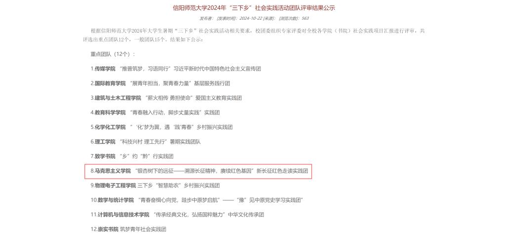 近日,信阳师范大学2024年“三下乡”社会实践活动团队评审结果公示。此次评选依据相关要求,由校团委组织专家对全校各学院(书院)社会实践项目汇报进行评审,金年会jinnianhuicom“溯源长征精神,赓续红色基因”新长征红色走读实践团评选为重点团队。