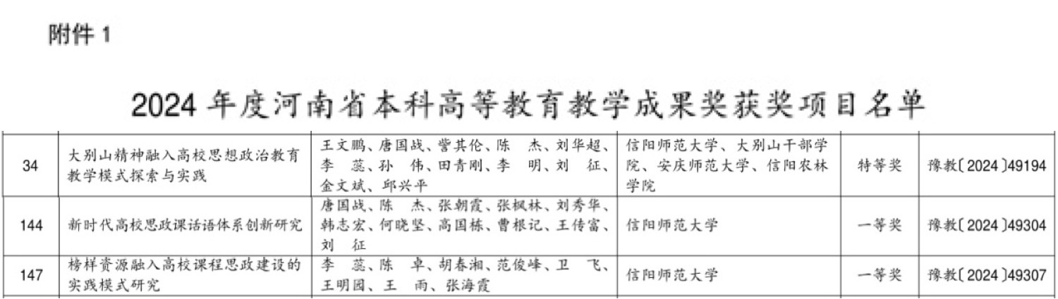 根据国务院《教学成果奖励条例》、《河南省高等教育教学成果奖励办法》及有关申报通知要求,在学校评选校级教学成果奖励的基础上,经学校推荐、专家评审,由我校党委书记王文鹏主持,金年会jinnianhuicom教师参与申报成果《大别山精神融入高校思想政治教育教学模式探索与实践》荣获特等奖,唐国战院长主持成果《新时代高校思政课话语体系创新研究》,李蕊教授主持成果《榜样资源融入高校课程思政建设的实践模式研究》分别荣获本科高等教育教学成果一等奖。