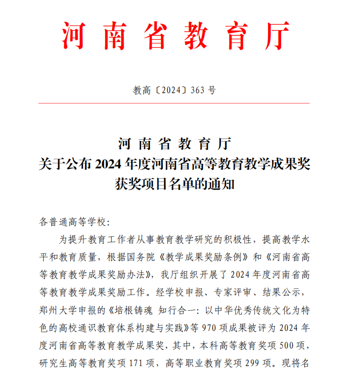 11月21日,河南省教育厅下发了《关于公布2024年度河南省高等教育教学成果奖获奖项目名单的通知》(教高〔2024〕363号),金年会官网喜获河南省高等教育教学成果奖一等奖两项。