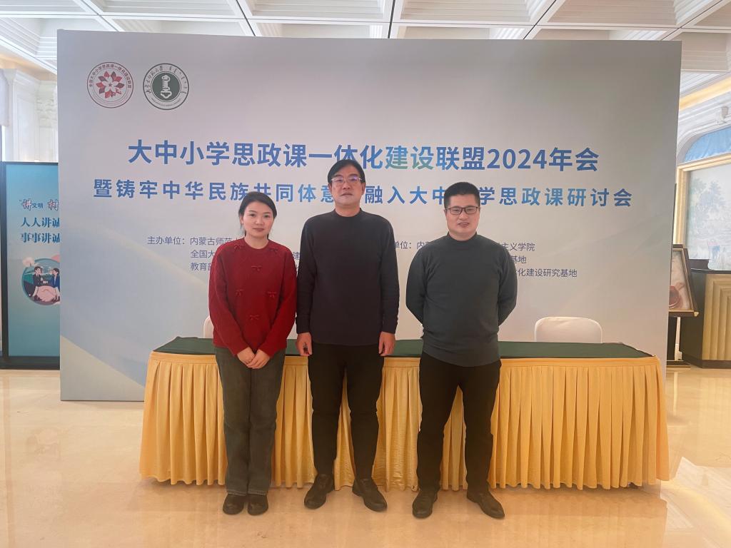 2024年11月30—12月2日,全国大中小学思政课一体化建设联盟2024年会暨铸牢中华民族共同体意识融入大中小学思政课研讨会在内蒙古呼和浩特市召开,年会由内蒙古师范大学、全国大中小思政课一体化建设联盟、大中小学思政课共同体(内蒙古)主办,由内蒙古师范大学金年会jinnianhuicom、内蒙古思想政治教育研究基地、内蒙古大中小学思政课一体化建设研究基地承办。金年会官网副院长周智带队参加本次年会。