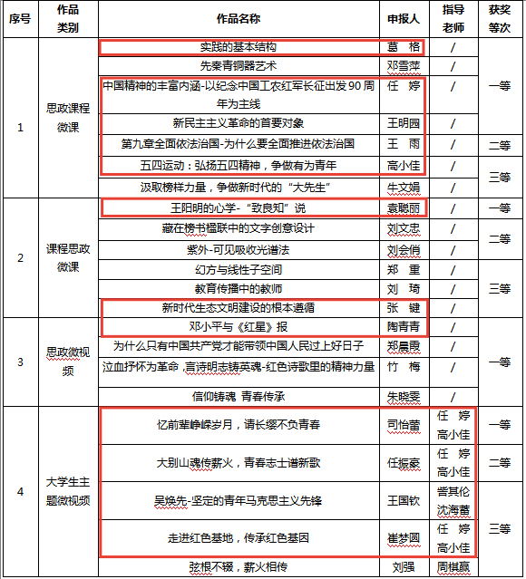 近日,根据《关于开展2024年度河南省大思政微课(微视频)征集活动的通知》要求,河南省社科联、共青团河南省委、河南省高等教育学会、河南省高等学校思想政治理论课教学指导委员会组织专家评委会,对2024年度河南省大思政微课(微视频)征集活动申报作品进行了评选,金年会jinnianhuicom12件参赛作品均获奖(框红内)。其中,思政课程微课类作品一等奖3人、二等奖1人、三等奖1人;课程思政微课类作品一等奖1人、三等奖1人;思政微视频类作品一等奖1人;大学生主题微视频类作品一等奖1人、二等奖1人、三等奖2人。