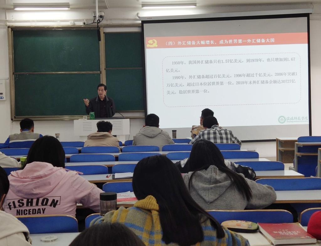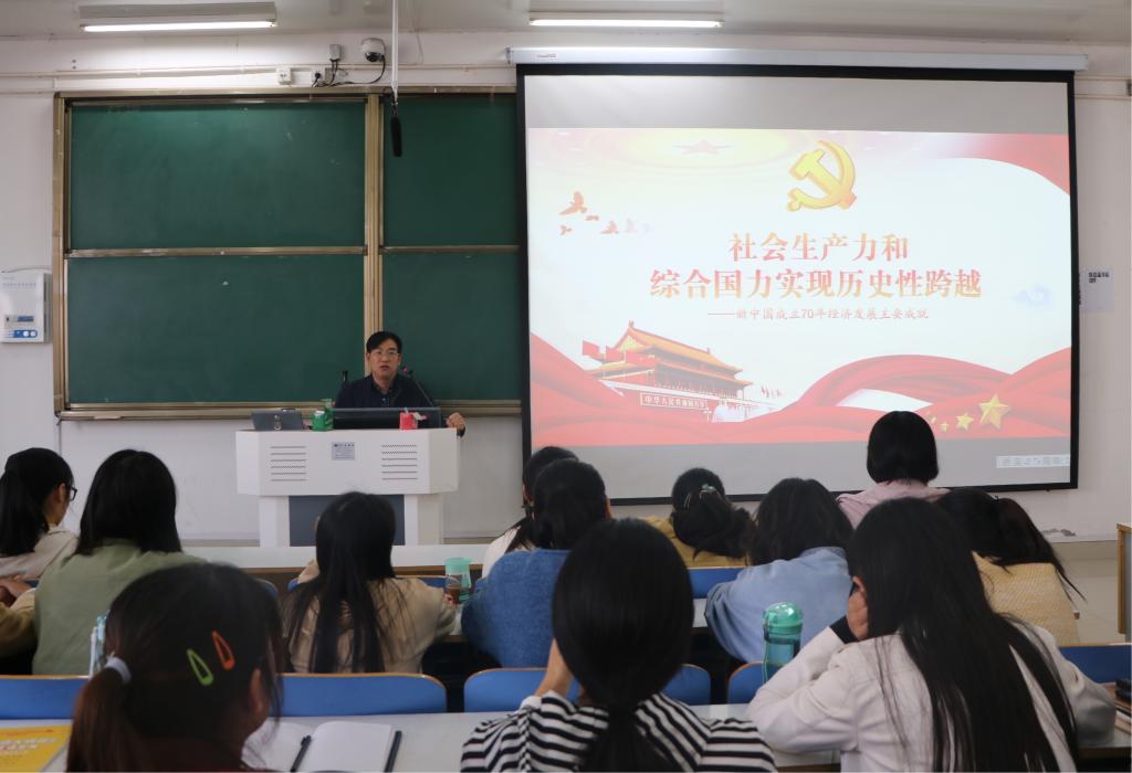 周智以新中国成立70年经济发展的主要成就为主线,从国民经济、供给能力、经济结构、基础设施、对外贸易以及人民生活六方面对新中国取得的发展成就进行详细阐述。他结合自身实际经历全面深入解析了中国经济发展的历程和变化,使同学们真切感受到新中国综合实力的增强、国际地位及影响力不断提高、供给能力实现质的飞跃、经济结构的重大调整等显著变化。黄世明从宏观、微观两层面对中国经济发展进行全方位多角度的解读,他指出,从大国重器到轻工业制造、从一穷二白到科技强国、从温饱不足到实现全面小康的历史性转变,无一不彰显着中国正逐步走向世界舞台中央。同时他结合新中国70年来的蓬勃发展,着重强调社会生产力显著提高是我国社会主义制度所提供的强大支撑与保障的结果。