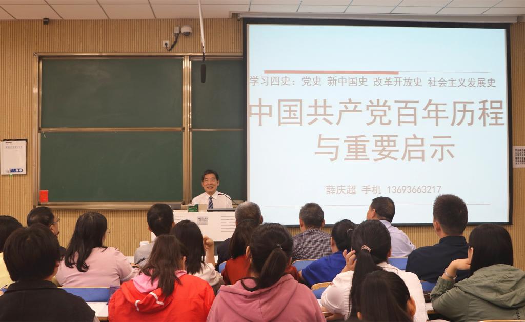 薛庆超援引习近平总书记关于“学习党史、国史,是坚持和发展中国特色社会主义,把党和国家各项事业继续推向前进的必修课”的重要论述,以中国共产党艰苦卓绝的奋斗历程为主线,从八个方面全景式地展现了中国共产党从大革命时期、土地革命时期、抗日战争时期、解放战争时期、社会主义革命和建设时期、改革开放时期到决胜全面建成小康社会时期波澜壮阔的历史图景。他详细阐述了中国共产党领导人民从苦难走向辉煌的百年奋斗历程,指出中国共产党取得胜利的关键在于善于总结经验,汲取教训。整场报告内容丰富、脉络清晰、旁征博引、深刻透彻,具有较强的指导借鉴意义。会后,薛庆超在社科楼323会议室,就大别山精神内涵,红旗渠精神的传承与发展等问题与金年会官网师生进行了深入的互动交流。