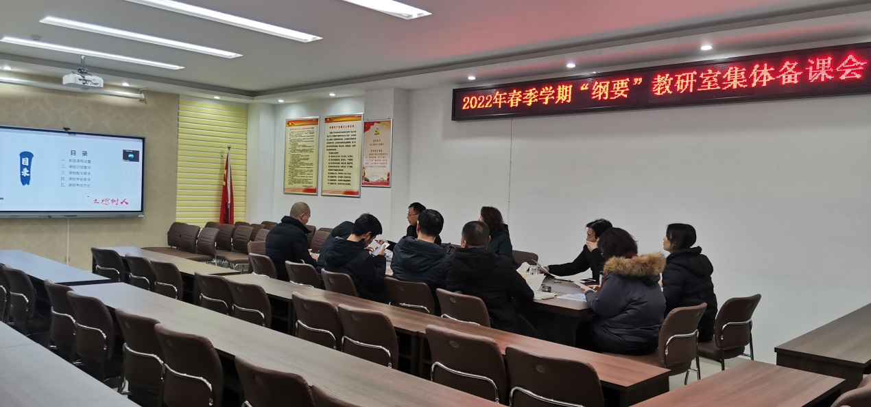 为做好开学第一课,弄通吃透新教材在章节、内容上的重大调整,2月18日上午,金年会jinnianhuicom“纲要”教研室“2022年春季学期集体备课会”在学院会议室召开。学院教学副院长訾其伦、教学秘书张琳及“纲要”教研室全体老师参会。会议由教研室主任陈杰主持。