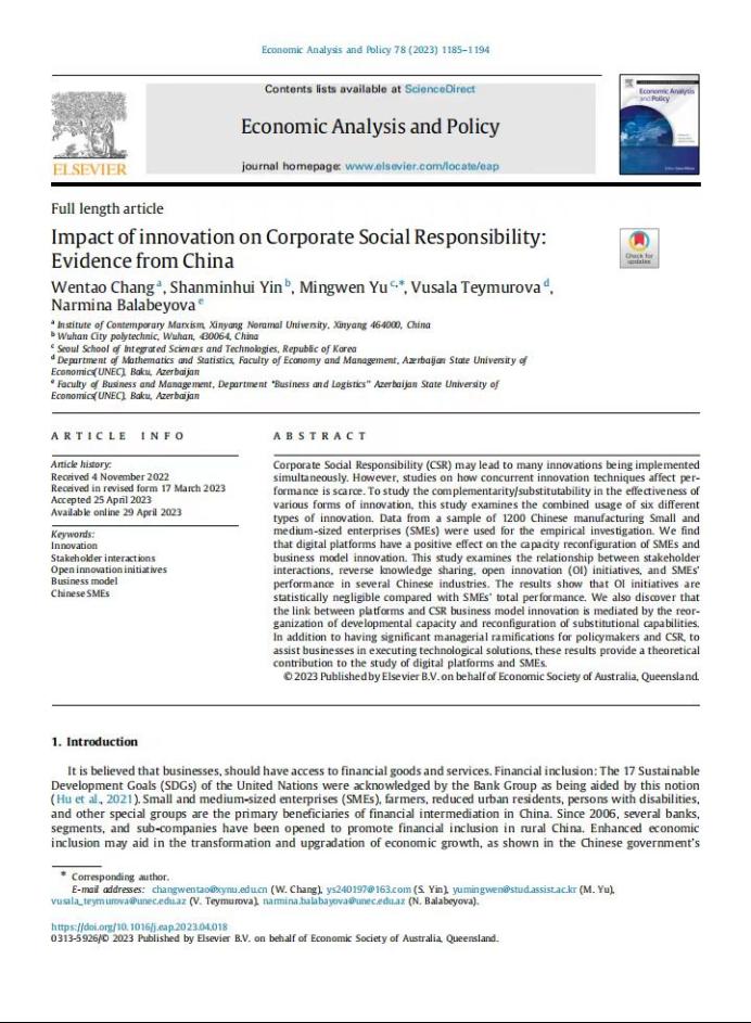 金年会官网常文涛博士在SSCI(JCR 一区)刊物《Economic Analysis and Policy》上发表题为“Impact of innovation on Corporate Social Responsibility: Evidence from China”的学术论文。