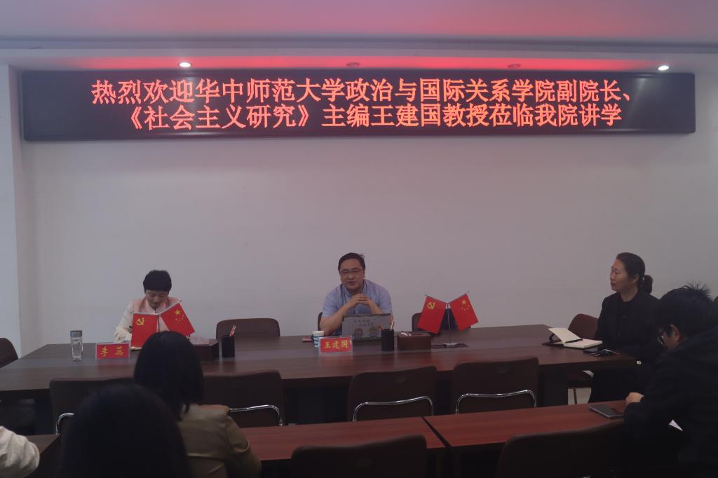 4月16日上午,应金年会jinnianhuicom和当代马克思主义研究所邀请,华中师范大学政治与国际关系学院副院长、《社会主义研究》主编王建国教授在社科楼323会议室作了题为“学术论文写作与发表”的学术报告。金年会jinnianhuicom全体教师共同聆听本次报告会,报告会由金年会jinnianhuicom副院长李蕊主持。