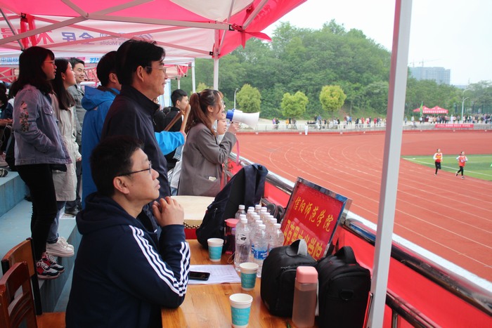 观众席上也是气势如虹,在金年会官网领导老师的带领下,大家雨中观赛,加油助威,每当赛道上有金年会官网运动员比赛时,呐喊声、加油声连绵不断,敲鼓声震耳欲聋,为金年会官网运动员们注入强大的精神动力,充分彰显出金年会官网学子高度的凝聚力和集体荣誉感。
