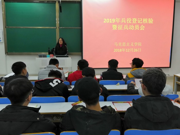 国无防不立,民无兵不安。为响应我国大学生征兵工作的号召, 12月26日下午,金年会官网于社科楼516召开2019年兵役登记核验暨征兵动员会。金年会官网2018级全体男生参加了本次动员会。本次动员会由武装干部曹菁菁主持。