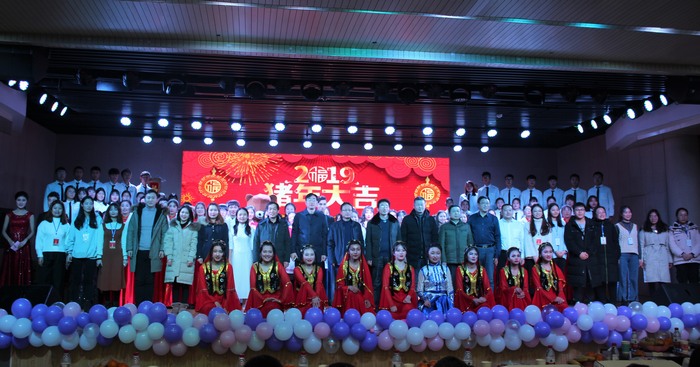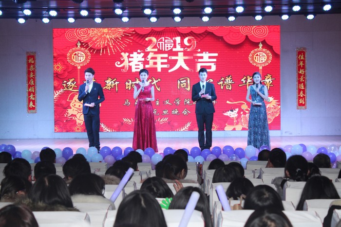 晚会开始前,院领导杨云善、唐国战等以VCR视频的形式总结回顾了2018年的工作,向全院师生表达了新年祝福。整场晚会将过去、现在、未来相串联,浪漫柔情与热情动感并存,流行文化与传统民族文化融合。活力满满的开场舞瞬间引爆全场,拉开了此次晚会的帷幕。轮滑表演和rap《友》使民族文化与现代元素激情碰撞,将晚会气氛瞬间点燃。小品《TFgirls》以诙谐的语言和动作引得在场观众捧腹大笑,向我们传达了追逐梦想不惧失败的深层意义。歌曲串烧《歌声飘过四十年》和舞蹈串烧《民族大团结》以悠扬的歌声和曼妙的舞姿,表达出对改革开放四十年的巨大变化的感慨和中华民族各族儿女对实现中国梦的期待。金年会官网党政领导班子与学生代表共同朗诵的《改革开放四十周年颂:中国奇迹》,饱含深情地歌颂出改革开放后中国特色社会主义建设所取得的伟大成就,将对祖国壮丽山河、对明天的希冀融在诗句中,表达出身为中华儿女的骄傲与自豪。整场晚会气氛高涨,高潮迭起,其中穿插的微信抽奖互动环节和“马院锦鲤”的抽选更加丰富了本场晚会的内容。最后,晚会在新时代合唱团的大合唱《在灿烂的阳光下》中落下帷幕。