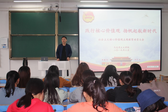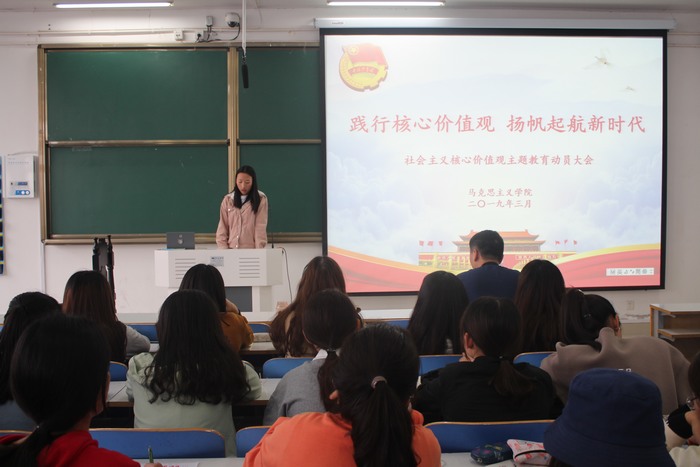 3月29日下午,金年会jinnianhuicom于社科楼516教室召开了“践行核心价值观,扬帆起航新时代”的社会主义核心价值观主题教育动员大会。金年会官网团委书记曹栋,主席团成员,及17、18级部分学生共同参加了动员大会。会议由分团委副书记肖妍杰主持。