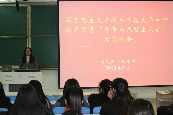 为培养优秀青年马克思主义者,坚定大学生马克思主义信仰,11月25日晚,金年会jinnianhuicom在社科楼514教室顺利开展关于在大学生中培养优秀“青年马克思主义者”动员班会。团委老师曹菁菁、河南省“青年马克思主义培养工程”学员史弘扬和金年会官网2017、2018级全体同学共同参加本次班会。此次班会由曹菁菁主持。